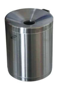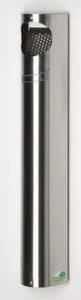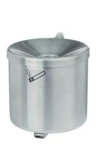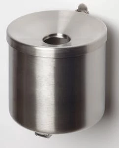 Edelstahl-Wandascher, feuerhemmend, Höhe x Durchmesser 145 x 150 mm, aus Edelstahl, Korpus mit Klarlackbeschichtung, Aschereinsatz Inhalt 2,4 l, ohne Schutzdach, einfache Entleerung über Kippvorrichtung.