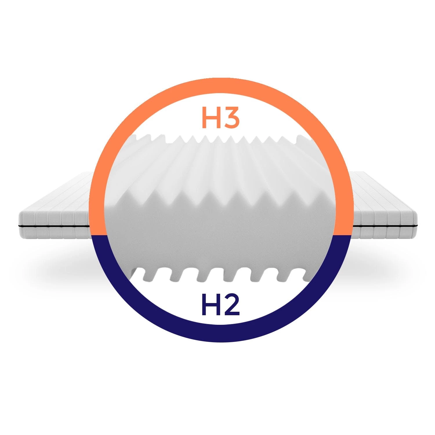 Für erholsamen Schlaf ist die Wahl des richtigen Härtegrades ausschlaggebend. Diese Matratze ermöglicht es die Festigkeit der Matratze nach ihren Vorlieben flexibel anzupassen. Wende Sie die Matratze auf die H2-Seite (abgerundetes, pilzförmiges Muster) für ein weicheres Liegegefühl oder auf die H3-Seite für ein festeres Liegegefühl (wellenförmiges Muster).