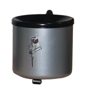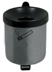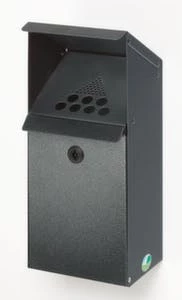 Wandascher, feuerhemmend, Höhe x Durchmesser 145 x 150 mm, aus Stahl, Korpus mit Pulverbeschichtung in neusilber, Aschereinsatz Inhalt 2,4 l, Kopfteil schwarz, ohne Schutzdach, verschließbar mit Zylinderschloss, einfache Entleerung über Kippvorrichtung.